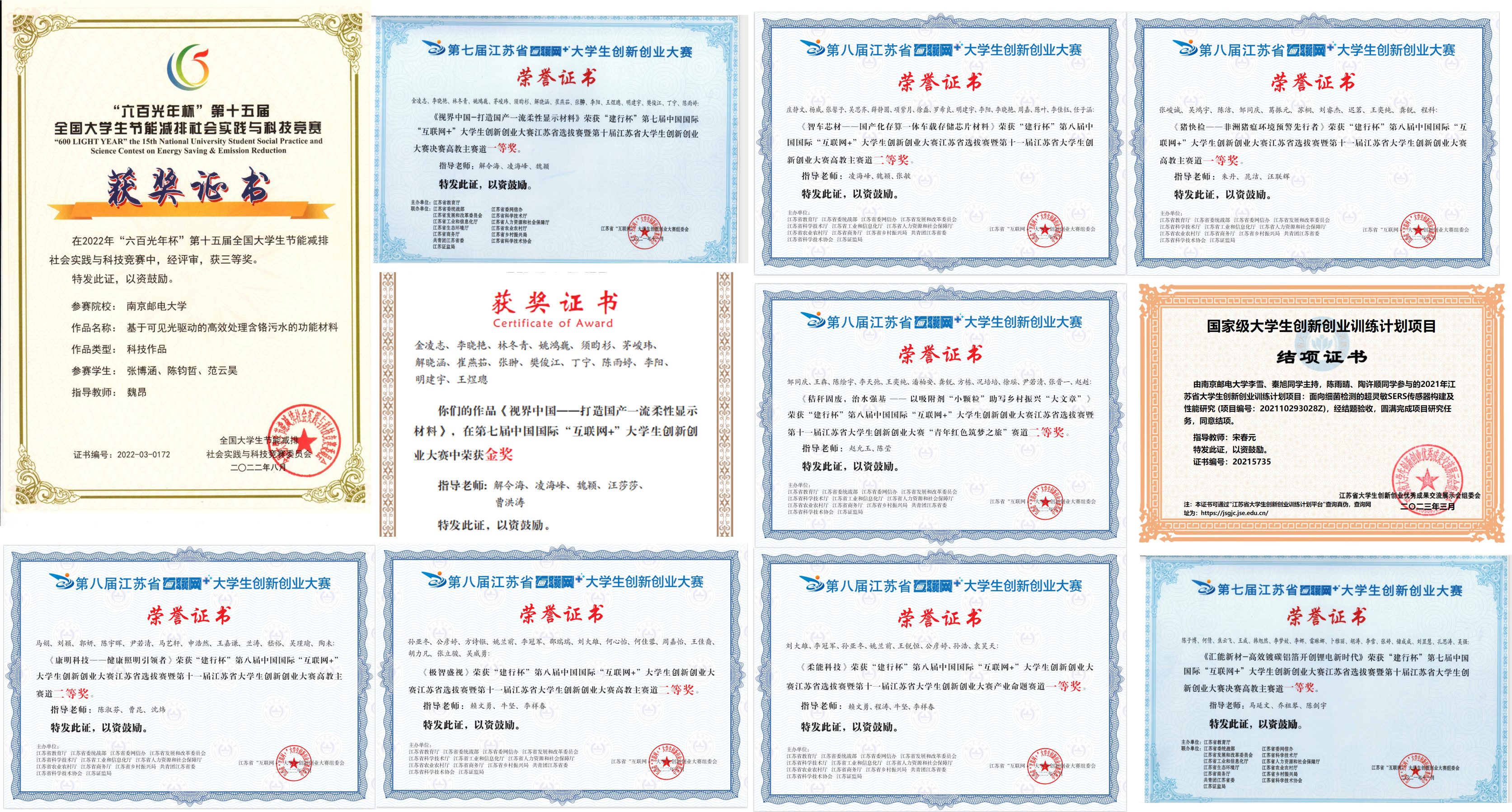 通过实验实践教学理念与体系创新、教学内容和教学手段的创新,取得了很好的实验实践教学成果和成效,近两年荣获全国“互联网+大赛”金奖4项,铜奖1项,省一等奖4项,二等奖4项,中国国际大学生创新大赛(2023)国赛金奖2项;近五年来,全国“挑战杯”竞赛获国奖6项,省级获奖4项,2022年“挑战杯”江苏省大学生创业计划竞赛获金奖1项,银奖1项,国赛获银奖2项,助力学校首次捧得“挑战杯”创业计划竞赛国赛“优胜杯”,2023年在第十八届“挑战杯”国赛上取得新突破,我院共获得全国一等奖1项、全国三等奖1项;获全国大学生节能减排大赛全国一等奖1项,二等奖1项,三等奖4项。近五年承担了STITIP国家级项目16项,省级项目17项。