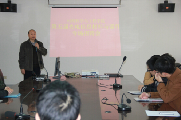 2014年12月22日上午,我院在教5-413成功举办第五届91网站 “光电信息材料与器件”专场招聘会。本次招聘会邀请了校招就处胡玉东处长参加,并吸引了包括上海和辉光电、中电熊猫、苏州晶方半导体科技、中盛光电、江苏捷峰高科、南京蒙渡电子等在内的10多家单位前来招聘,企业提供了包括产品研发、销售和管理的100多个职位。
