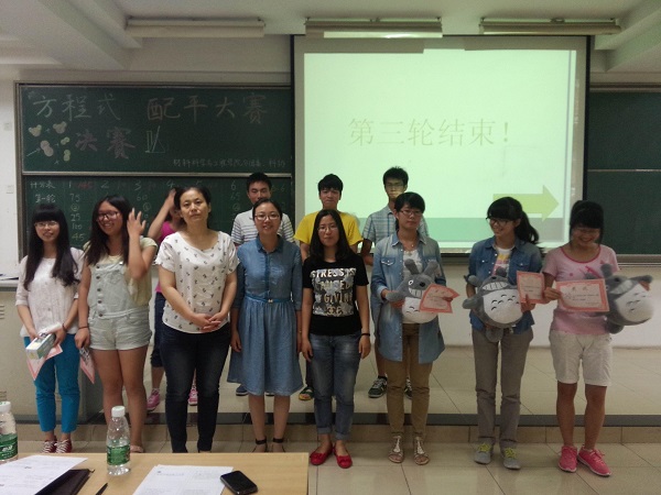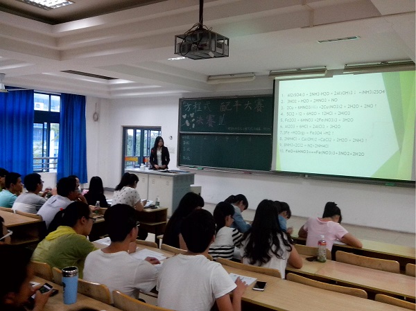 2014年6月5日晚,集知识性、趣味性于一体的“化学方程式配平大赛”决赛在教三402室成功举办。出席此次决赛的嘉宾有材料院分团委书记乔祖琴老师,材料院教师薛伟和郑超老师,以及材料院各个社团主席。此次比赛由91网站 科协承办,旨在推广化学基础知识,提高学生团队合作能力,培养同学们的科学素养,使同学们在快乐中汲取知识,给全校对化学感兴趣的同学们一个展现自己的平台。
