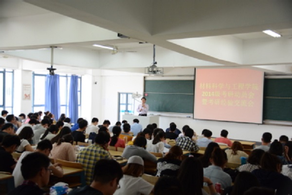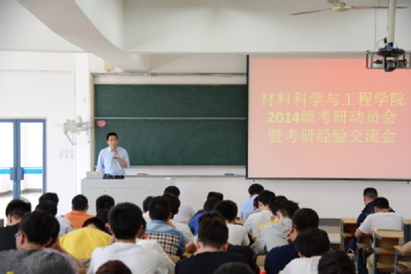 会议开始,于景宝副书记阐述本次动员、交流会的重要意义。随后沈清明副院长介绍了学院2013级本科生的考研情况,向同学们介绍学院的教育教学状况及本科培养体系。沈院长从国家导向、人生轨迹、事业成长三个方面重点为大家分析了考研的重要意义。同时,在考研方向的选择上,沈院长也悉心的提出来自己的指导建议。陈润峰副院长详细地为同学们介绍了学院的学科发展及学科与学业的关系,学院的优秀的教育教学平台为同学们准备好了学习进修的基础,本-硕-博三层次培养机制保障了研究生的培养质量,希望同学们都能考取本院的研究生,学院也为相应的激励政策,欢迎广大同学报考材料学院。