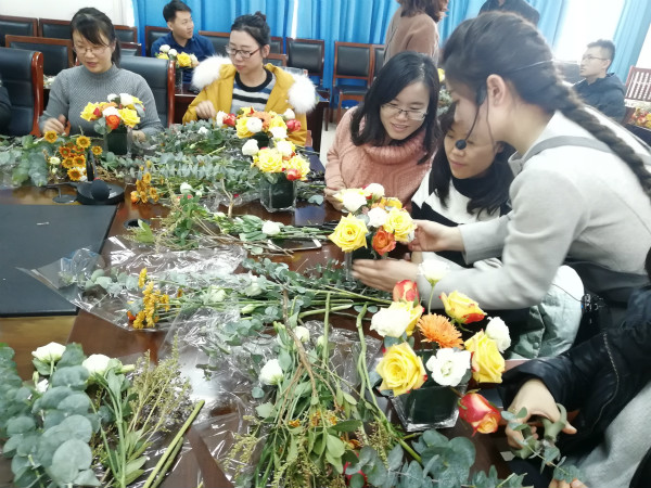 活动现场,许多教师第一次动手用专业的技巧插花,尤其吸引了许多男教师的参与,大家学习的非常认真。大家相互交流,心情舒畅,充分发挥想象力与设计灵感,将桌上零零散散的鲜花一步步地变成精美的花束。最终每一位活动参与者都完成了自己的插花成品,将这份喜悦和花香带回家中。