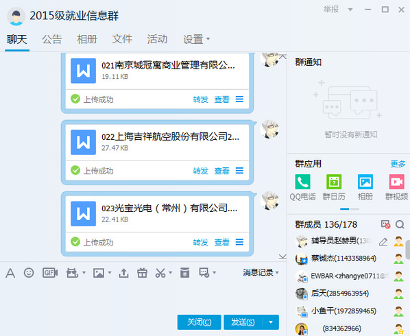 毕业生辅导员赵赫男及时更新就业信息数据,定时发布就业信息。线上依托“2015级就业信息”QQ群,实施发布并解读就业信息,11月累计发布就业信息240余条。通过谈心谈话,了解学生就业心态,掌握学生动态,鼓励学生积极参加各类招聘会。