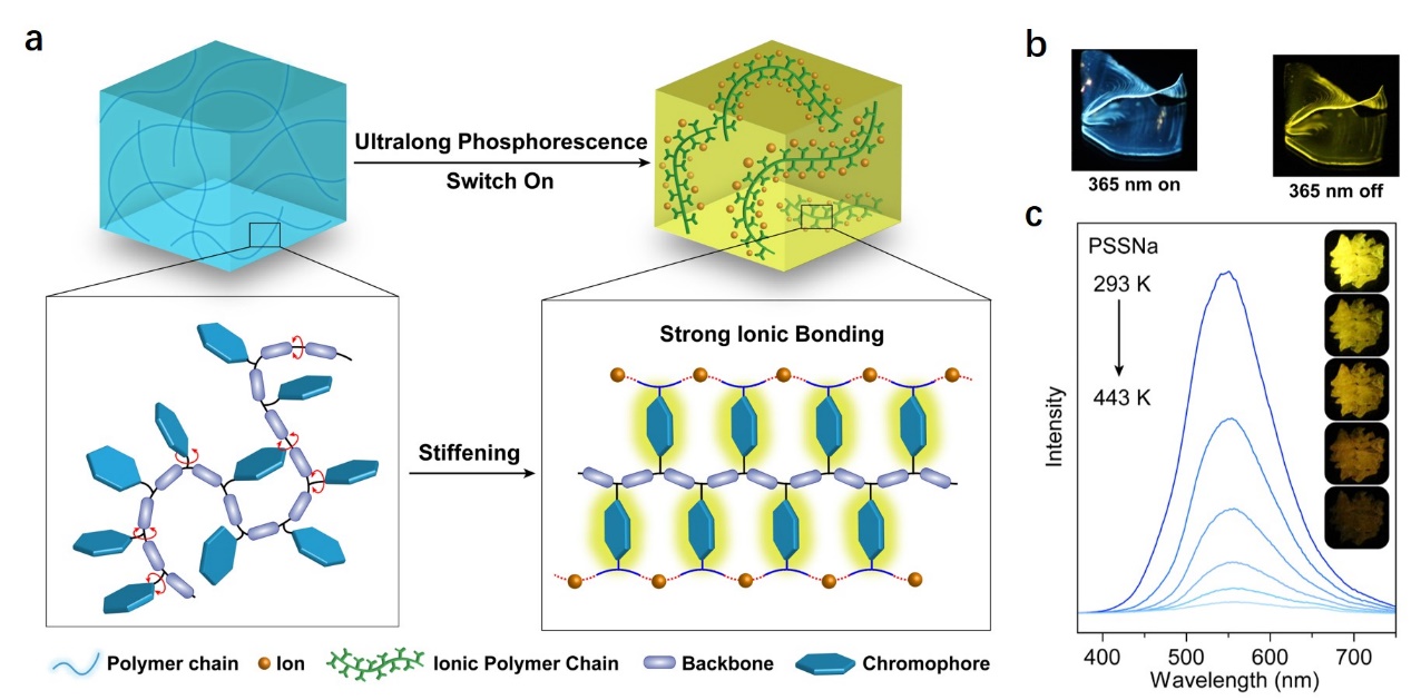 针对这一问题,91网站 信息材料与纳米技术研究院黄维院士和南京工业大学安众福教授带领的科技创新团队提出通过离子键锁定发光单元,在聚合物共价键的协同作用下,实现了离子型聚合物的长余辉发光,发射寿命长达2.1 s。实验数据和理论计算表明该类聚合物材料具有室温长余辉的原因是离子键抑制了发光单元的非辐射跃迁。该设计理念不仅适用于芳香型的聚合物材料体系,也是适用非芳香型的聚合物材料体系。此外,他们还首次报道了激发波长依赖的聚合物长余辉发光现象,实现余辉颜色从蓝到橙颜色可调。并且,该类材料在温度高达170 oC下,依然保持可视化长余辉发光。这一研究成果赋予传统的聚合物材料新的性能,加之材料来源广、成本低,在柔性显示、照明、数据加密以及生物医学等领域具有很大的应用前景。