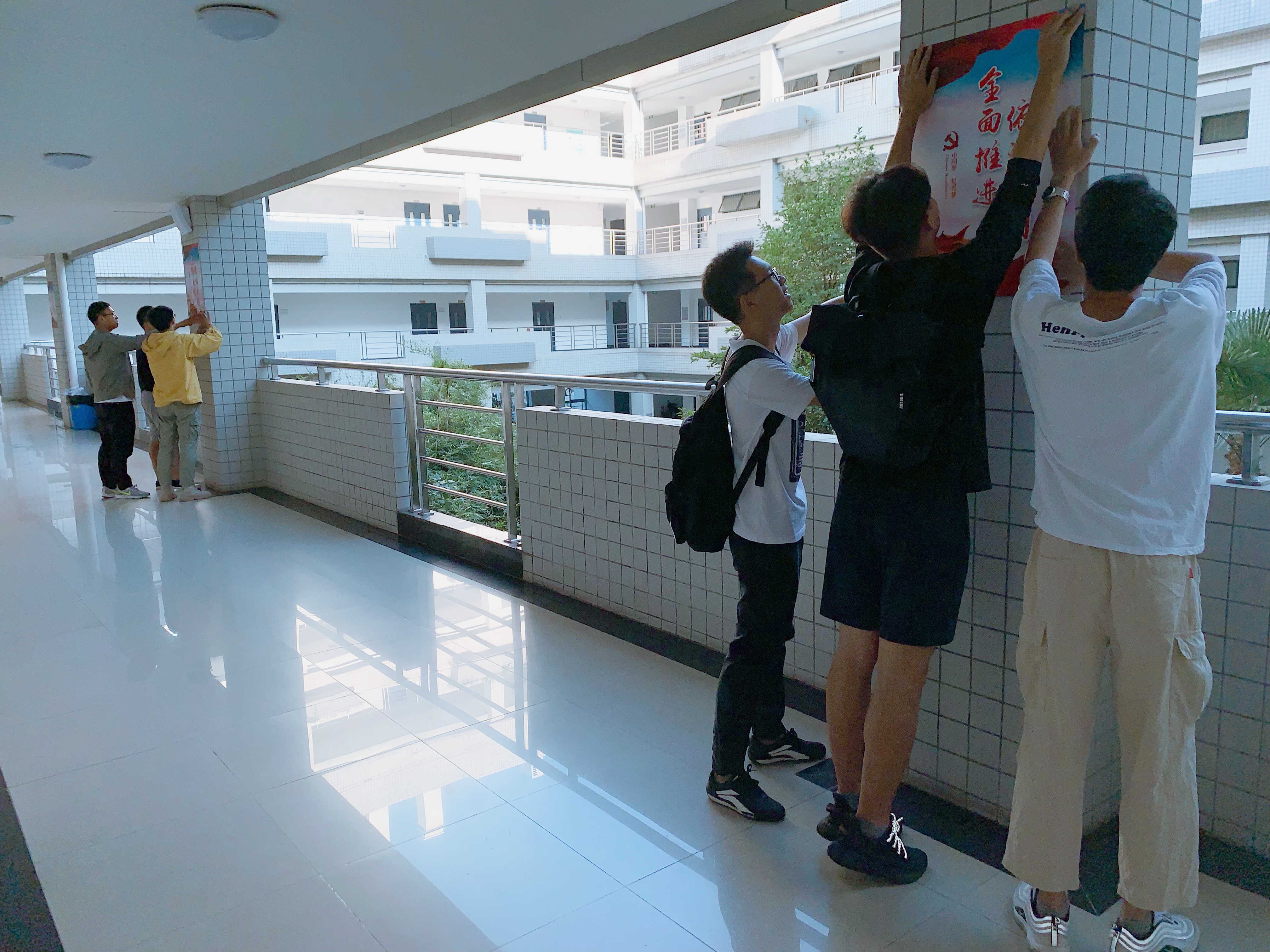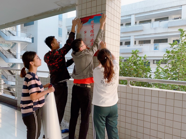 为确保张贴工作顺利有序进行,办公室党支部的党员同志们加班加点,连续奋战到深夜,与制作公司确定每一处细节,并特地用小纸条提前列出了每张海报不同的张贴位置,以确保张贴无误。活动当天,办公室党支部广泛发动学生党员、入党积极分子,早晨6:30到达学院,登梯爬高,仔细贴好每一块海报,确保每一张张贴位置符合要求,与学生党员、积极分子一起共同做好学科楼文化氛围的营造工作,最后在办公室全体党员和学院学生党员代表的共同努力下,材料院学科楼“不忘初心、牢记使命”主题教育氛围的布置工作圆满完成。