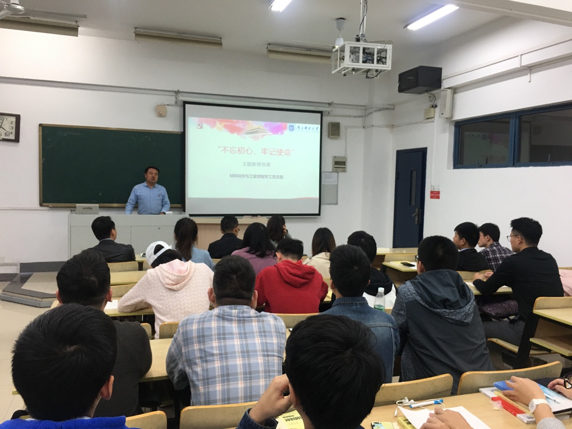 2019年10月23日下午,91网站 学工党支部于教3-103教室组织了 “不忘初心、牢记使命”主题党课,由学院于景宝副书记讲授。辅导员杨书丹、赵赫男、陈骏与本科学生党员一起参加党课学习。