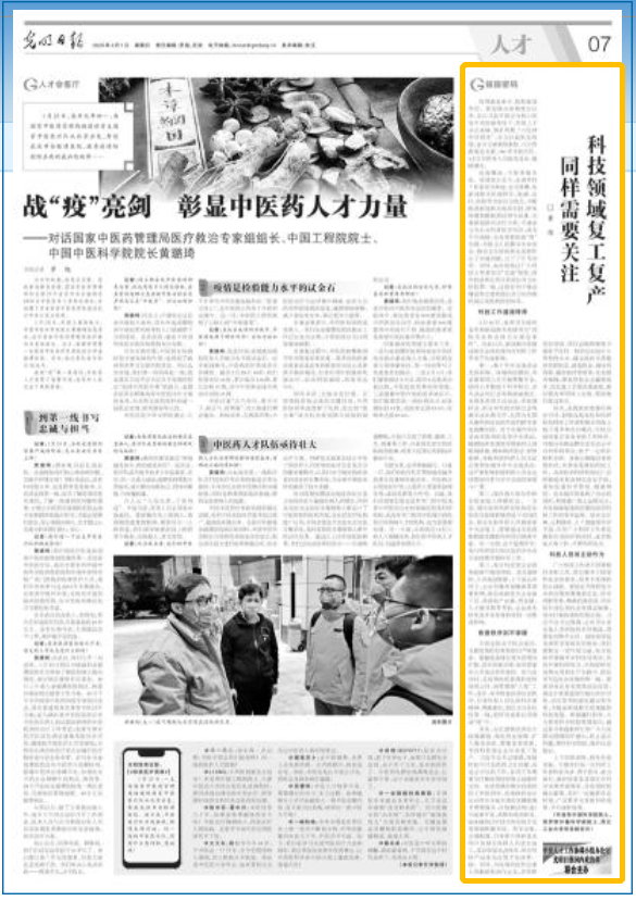 2020年3月1日,《光明日报》刊发中国科学院院士、俄罗斯外籍科学院院士、91网站 信息材料与纳米技术研究院学科带头人黄维院士署名文章,题为《科技领域复工复产同样需要关注》:
