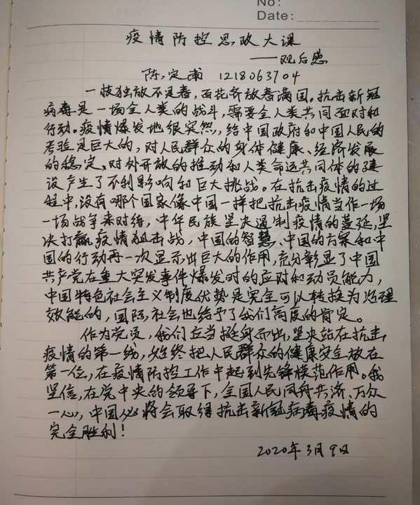 课程开始期间,同学们也都针对疫情面前人类是一个命运共同体及中国特色社会主义制度的优越性记录了笔记。在此期间,大家都积极交流,分享感受。