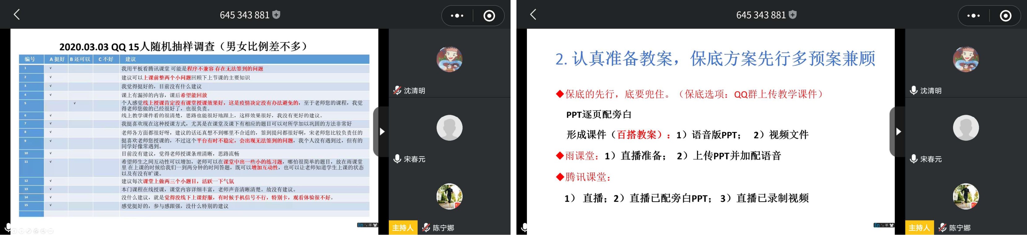 会后,老师们纷纷表示受益匪浅,很多自己在线教学过程中遇到的一些疑问和困惑都有了明确的解答。沈清明副院长对七位老师的专题讲座给予了积极的肯定,同时结合自身在线教学经历,积极解答了任课老师在在线教学过程中遇到的问题,并鼓励大家勇于探索,找到适合自己的教学方法,不断提高我院在线教学质量。通过在线投票,学院推选高宇和郑超两位老师作为线上教学先进典型。