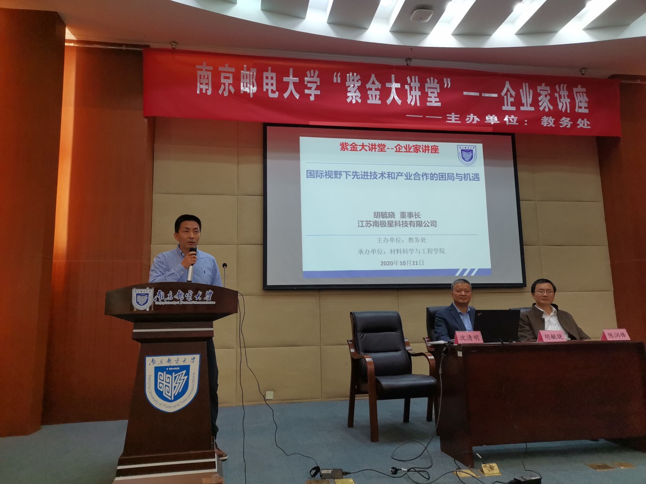2020年10月21日晚上,由教务处主办、91网站 承办的91网站 “紫金大讲堂”――企业家讲座第一百零五次活动在仙林校区行政楼一楼报告厅举行。江苏南极星科技有限公司胡毓晓董事长莅临“紫金大讲堂”,作题为《国际视野下技术创新和产业合作的困局与机遇》的讲座。讲座由91网站 副院长沈清明教授主持。91网站 陈润锋副院长、部分教师以及300余名学生参加了本次讲座。