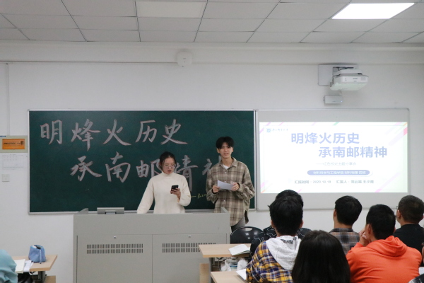 为使同学们深入了解“战邮历史”,深刻体会“战邮精神”,91网站 B200504班于2020年10月20日晚开展了以“明烽火校史,承南邮精神”为主题的学习红色校史主题班会。班会由范云昊和王少青主持, 2020级辅导员徐磊及2020级B200504班全体同学参会。