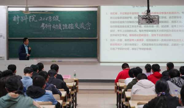 沈清明副院长首先分析了2018级同学面临的考研情况。一方面,去年新增的40万考生以至874万的巨大总量;另一方面,报考和录取人数都再创新高,机遇与竞争并存。沈院长从学历贬值、工资水平和成功助力三方面为同学们分析考研原因;再与出国、就业相比较,指出考研的独到优势;出发于考研难度,设身处地地分析了当下同学们的学习状况、竞争能力;最终就学校选择方式进行指导,大家发现材料院以地理优势,名师指导,学校助力深造等特点将成为同学们的绝佳选择。老师亲切寄语同学们:“非学无以广才,非志学无以成学。为学之要贵在勤奋,贵在钻研,贵在有恒。”