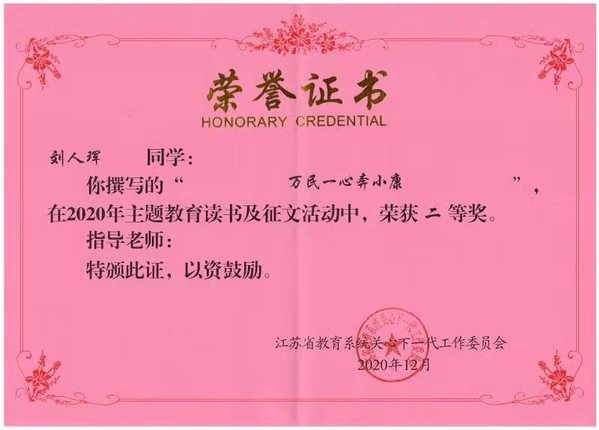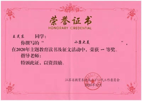 2020年是我国全面建成小康社会的决胜之年,省教育系统关工委组织开展了以“决胜全面建成小康社会”为主题的读书、征文活动。我院积极响应本次活动,并从众多稿件中仔细挑选了王昊东同学和刘人珲同学的文章代表我院参加此次征文比赛,经校关工委遴选脱颖而出,而后经省教育系统关工委专家组多轮评审,分别获得一二等奖,为院争光。