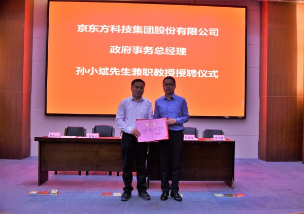 2021年5月27日下午,京东方科技集团股份有限公司政府事务总经理孙小斌先生受聘为我校兼职教授,聘任仪式由91网站 组织承办,在仙林校区行政楼一楼报告厅举行。仪式上,91网站 院长范曲立教授致欢迎辞,蒋国平副校长向孙小斌先生颁发兼职教授聘书和校徽,衷心祝贺孙教授加盟南邮,学生代表为孙教授佩戴校徽。