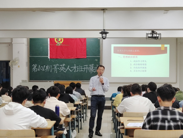 5月20日晚,91网站 菁英人才学校第一课于仙林校区教4-300举行。本次课程由学院党委副书记张建平主讲,他首先对菁英人才培训班成功举办表示祝贺,随后围绕大学生如何提升素质,做到全面发展为内容开始授课。