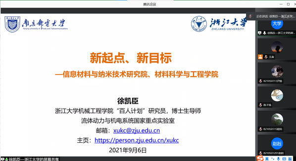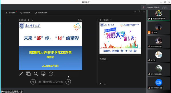 2021年9月6日上午,我院在腾讯会议上开展了2021级新生大会。院长范曲立,副院长沈清明,高层次人才赖文勇、高丽、谢燕楠和谢晨,杰出校友徐凯臣、生凯和张婷婷以及2021级新生参加会议。会议由院党委副书记、副院长张建平主持。