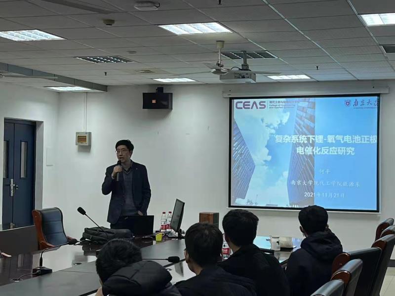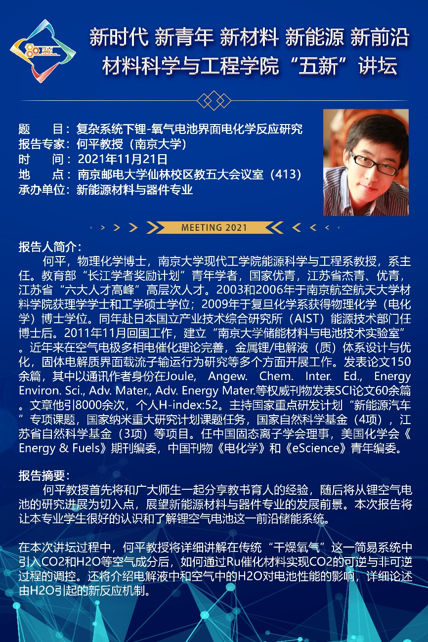 为促进新能源材料与器件本科专业学生的全面发展,增进同学们对本专业的认知和认同感,拓展本专业学生的国际视野,培养本专业学生的创新思维和创新能力,推进专业创新创业教育与专业教育的深度融合,实现为国家培养满足社会需求、掌握最新前沿技术和创新能力的新时代新能源材料高端人才的最终目标。20211121日上午1000,新能源材料与器件专业在学校教五413会议室成功举办了首期主旨为“新时代、新青年、新材料、新能源、新前沿”的“五新”讲坛专家报告会。此次讲坛的专家为南京大学现代工程学院新能源科学与技术专业系主任、国家优秀青年基金获得者何平教授。报告由新能源材料与器件专业系主任黄镇东副教授主持,新能源材料与器件专业的全体本科生和班主任闫伟博老师参加了本次报告会。