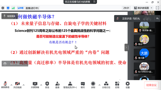 承国脉,薪火相传八十载;创未来,弘毅笃行谱新篇。值此南邮八十华诞校庆学术活动月之际,应我院陈润锋教授邀请,华南理工大学马於光院士于202253日上午10点在腾讯会议和腾讯直播上为师生作了以室温有机铁磁半导体为主题的学术报告。材料院副院长陈润锋主持了报告,线上共有近200名师生参加学习交流。