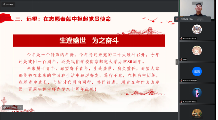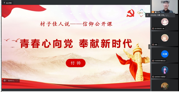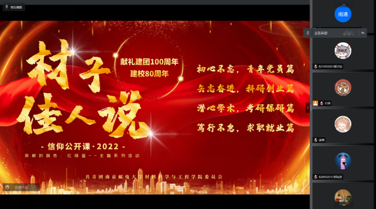 2022年4月6日晚,由91网站 分团委举办的“材子佳人说”--信仰公开课火热开讲。课程包含四个篇章:初心不忘、青年党员篇,矢志奋进、科研创业篇,潜心学术、考研保研篇,笃行不怠、求职就业篇。课程邀请优秀青年学子讲青春故事,讲奋斗故事,讲南邮故事,传播柚子声音,汇聚青春正能量。