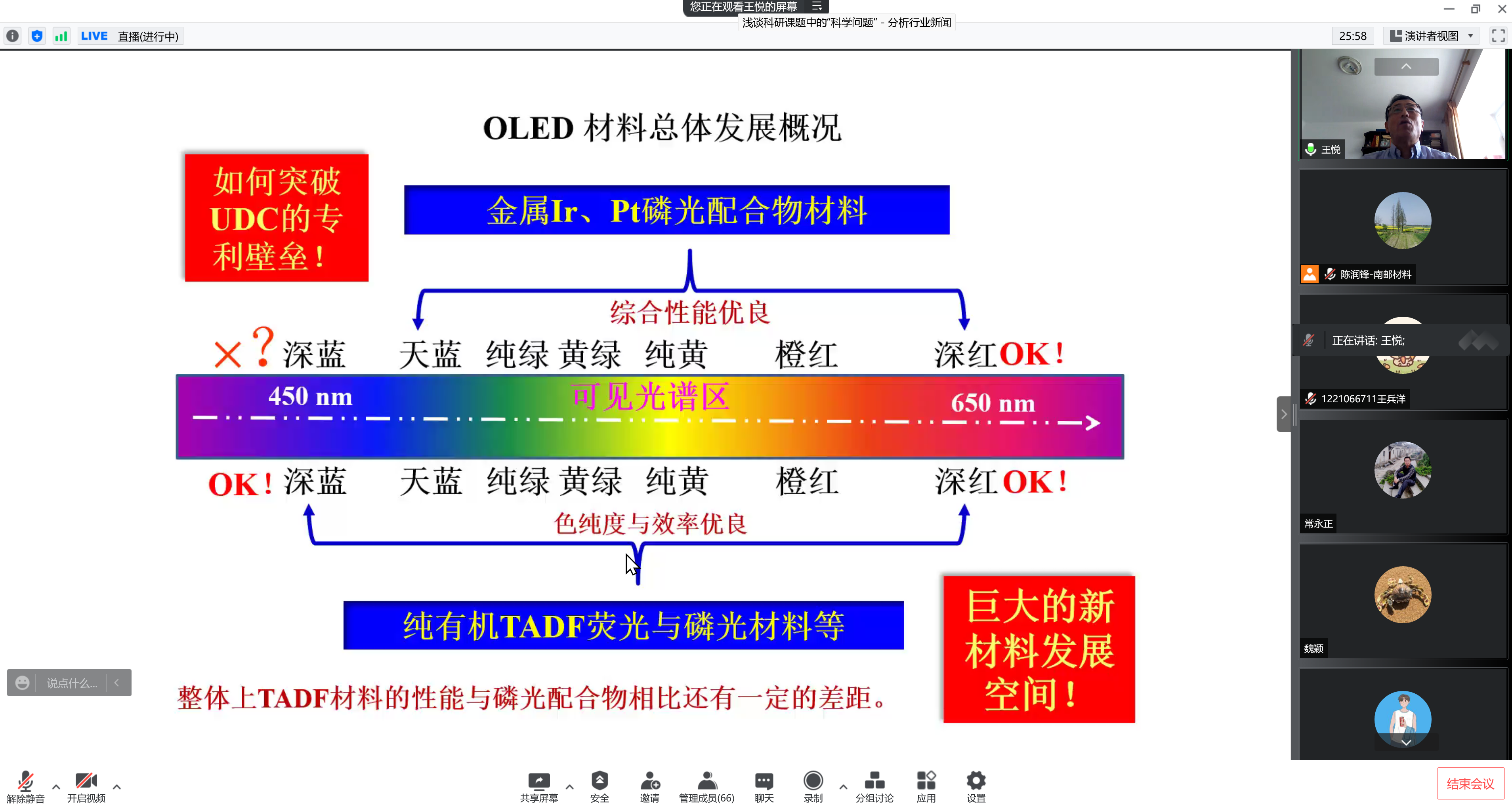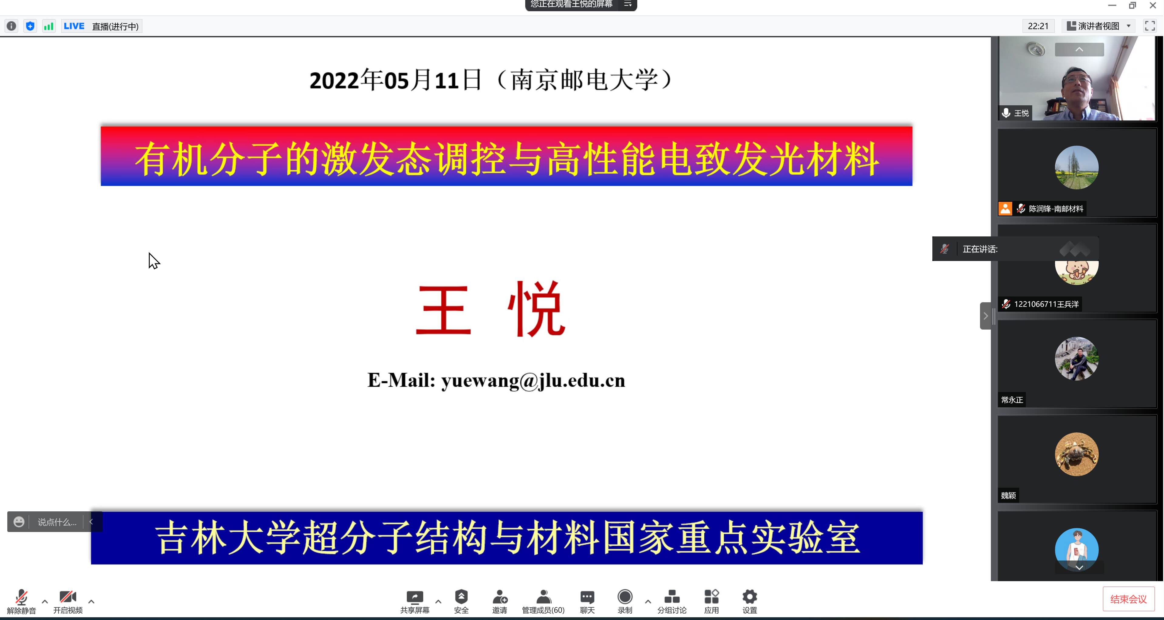 承国脉,薪火相传八十载;创未来,弘毅笃行谱新篇。值此南邮八十华诞校庆学术活动月之际,应我院陈润锋教授邀请,吉林大学王悦教授于2022511日下午2点在腾讯会议和腾讯直播上为师生作了以有机分子的激发态调控与高性能电致发光材料为主题的学术报告。陈润锋教授主持了报告,线上共有近100名师生参加。