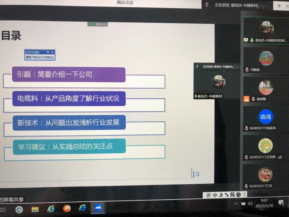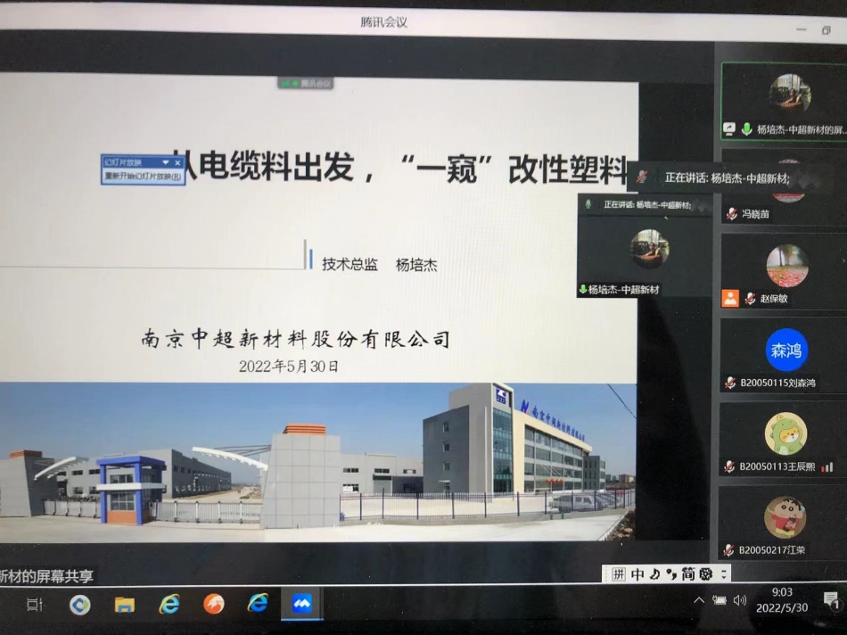 2022年5月30日上午,南京中超新材料有限公司杨培杰总经理为我院高分子材料与工程专业学生作了一场生动且富有实用意义的报告。报告由91网站 高分子材料与工程系系主任冯晓苗教授主持,系副主任赵保敏和B200501、B200502两个班全体同学参加了本次线上报告。