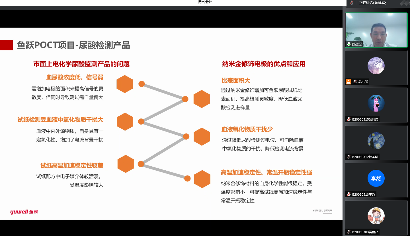 然后,陈总对鱼跃集团正在开发的POCT产品进行了具体介绍。通过对比现有商业化产品与正在开发产品的优缺点,指出开发新型POCT产品的必要性和重要性,为家用尿酸即时、快速、稳定检测提供重要保障,无须去医院排队,节省时间和金钱。