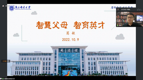 10月9日晚,91网站 、化学与生命科学学院通过线上会议形式开展2022级本科新生家长会暨“智慧父母·智育英才”暨家庭教育指导讲座,91网站 化学与生命科学学院党总支书记、校地共建办公室主任葛敏受邀主讲,会议由学院副书记兼副院长吕蔷蔷主持,全体本科新生家长参加会议。