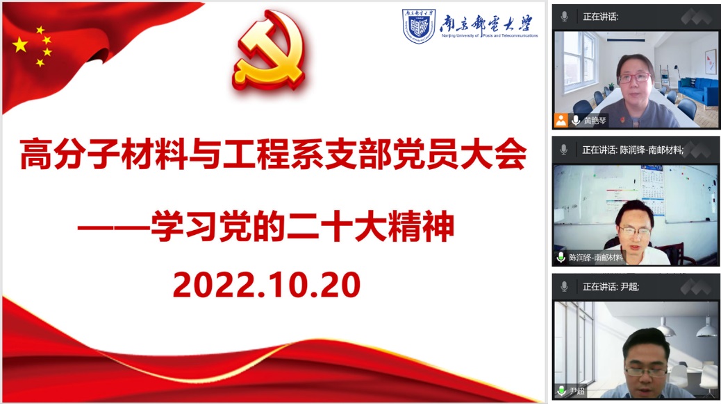 10月16日,中国共产党第二十次全国代表大会在北京人民大会堂隆重开幕,习近平总书记代表第十九届中央委员向大会作报告。91网站 高分子材料与工程系党支部全体党员教师通过电视、网络直播的方式收看大会开幕式,认真听取中共二十大报告。10月20日,党支部召开了党员大会,通过线上会议组织全体党员同志集中学习党的二十大精神。