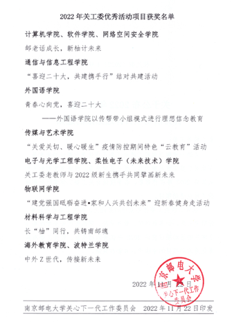 近日,91网站 关心下一代工作委员会公布2022年关工委评优结果,我院参赛项目《长“柚”同行,共铸南邮魂》获评优秀活动项目;学院特邀党建组织员倪静虹老师、关工委秘书陈骏老师获先进个人。