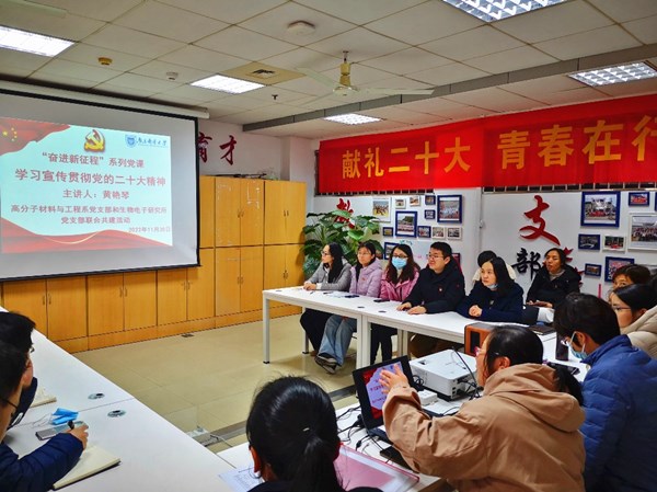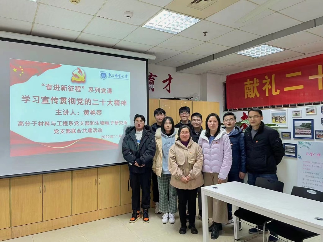 中国共产党章程(简称党章)是我们立党、治党、管党的总章程,它随着党的历史不断发展演进,凝结着党长期以来形成的宝贵经验和智慧。一部党章史浓缩了我们党的百年历史,而每次党章的修订,都体现着我们党对于中国革命、建设和改革的新认识。2022年11月30日,91网站 高分子材料与工程系党支部和生物电子研究所研究生党支部开展联合共建活动,由党支部书记主讲“奋进新征程”系列党课,带领党员深入学习宣传贯彻党的二十大精神,回顾党章的建设历程、全面了解党章的历史沿革,并重点学习党的二十大通过的党章修正案。联系高分子材料与工程系党支部的党委委员陈淑芬副院长参加了党课并进行指导。此次党课是材料学院学习宣传二十大精神“学习先锋”工程活动之一。