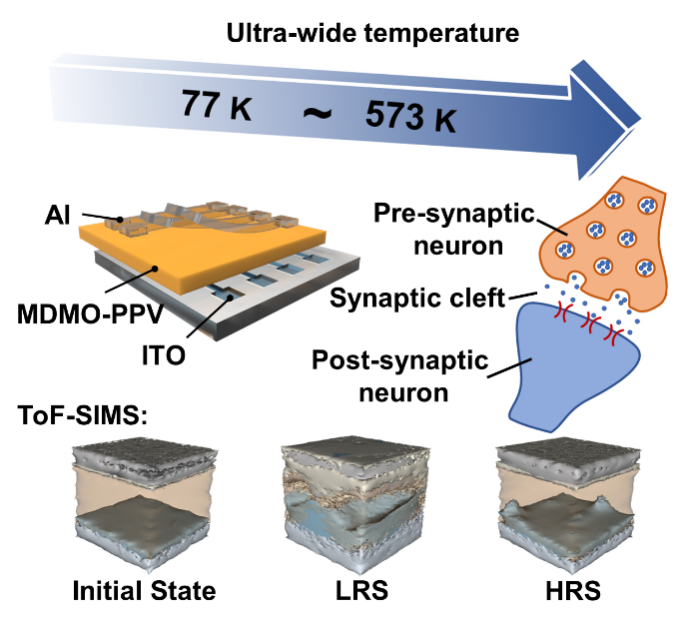 神经形态芯片旨在通过模仿构成人脑的神经元和突触的工作机制来构建人工神经网络硬件,快速高效地处理高度复杂的信息处理任务,从而实现人工智能。模拟型忆阻器具有可控缓变的多阻态特性,在外加电压等条件刺激下能够实现与神经突触相关的兴奋和抑制性突触后电流现象,可模拟神经突触的学习和记忆功能,因此可应用于神经突触仿生、神经形态计算等领域。近年来,有机半导体忆阻器因具有光电功能可调、可低温溶液及大面积加工、质量轻且柔性可弯折等优点而引起国内外研究者们的广泛关注和研究。目前,基于有机半导体神经形态忆阻器已经实现了一系列复杂的计算任务,包括超低功耗的并行计算、建立人工神经网络等。然而,目前已报道的有机半导体神经形态忆阻器通常表现出较低的热耐受性,导致器件性能在极热或极寒环境下快速退化甚至失效,因而极大限制了基于有机半导体忆阻器的神经形态系统在工业制造、能源勘探、航空航天等领域的应用。因此,构建具有超宽工作温度的有机半导体神经形态忆阻器具有十分重要的科学意义和应用价值。