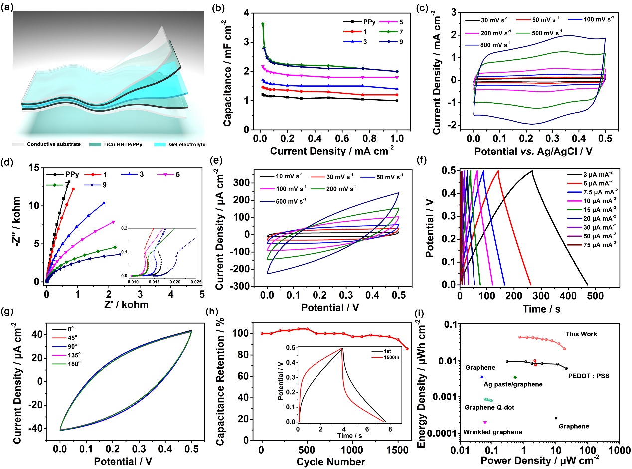 近日,南京邮电大学91网站 、有机电子与信息显示国家重点实验室赵强教授、赵为为副教授团队和中科院福建物质结构研究所袁大强教授团队合作,提出了一种金属离子辅助转化策略,以二维Ti3C2Tx为前驱体,合成了具有非互穿srs框架的基于儿茶酚的三维TiCu-HHTP(HHTP = 2,3,6,7,10,11-六羟基三苯)MOF,成功扩展了耐酸性金属前驱体和有机配体的多样性。该策略表现出了良好的普适性,Ti3C2和辅助金属Cu2+离子可以扩展到V2C MXene和辅助金属离子Mn+(M = Ni2+、Co2+、Mn2+和Zn2+)。转化机制包括从Ti3C2纳米片到辅助金属离子的电荷转移、Ti-C键断裂以释放Ti4+离子以及Ti4+/Mn+与HHTP之间的强螯合配位协同促进形成TiCu-HHTP。同时,Cu2+离子的引入赋予了TiCu-HHTP表面氧化还原赝电容活性。独特的3D导电网络和丰富的氧化还原位点赋予了TiCu-HHTP-7/PPy复合透明导电电极(TCEs)快速的离子/电子传输和可逆的法拉第反应。在0.02 mA cm-2电流密度下,TiCu-HHTP/PPy TCEs的面积比电容值达到3.63 mF cm-2,明显高于纯PPy TCEs的面积电容值(1.79 mF cm-2)。TiCu-HHTP/PPy透明超级电容器在0.75 µW cm-2的功率密度下,能量密度为0.042 µWh cm-2。