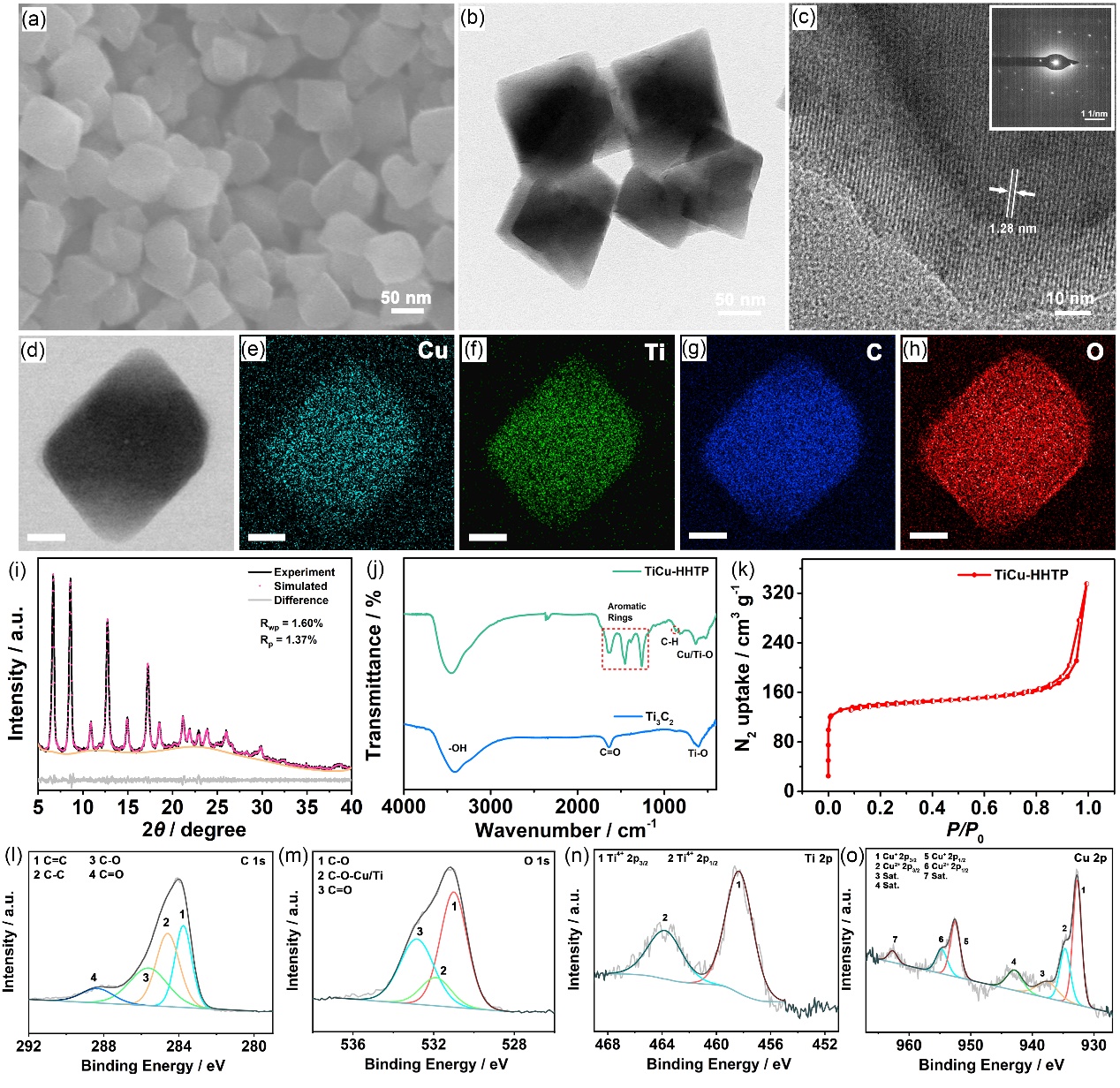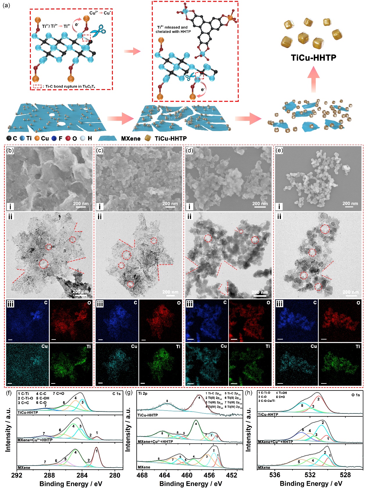 图3. 二维Ti3C2Tx纳米片衍生制备TiCu-HHTP MOF的形成机理及随时间变化的结构表征