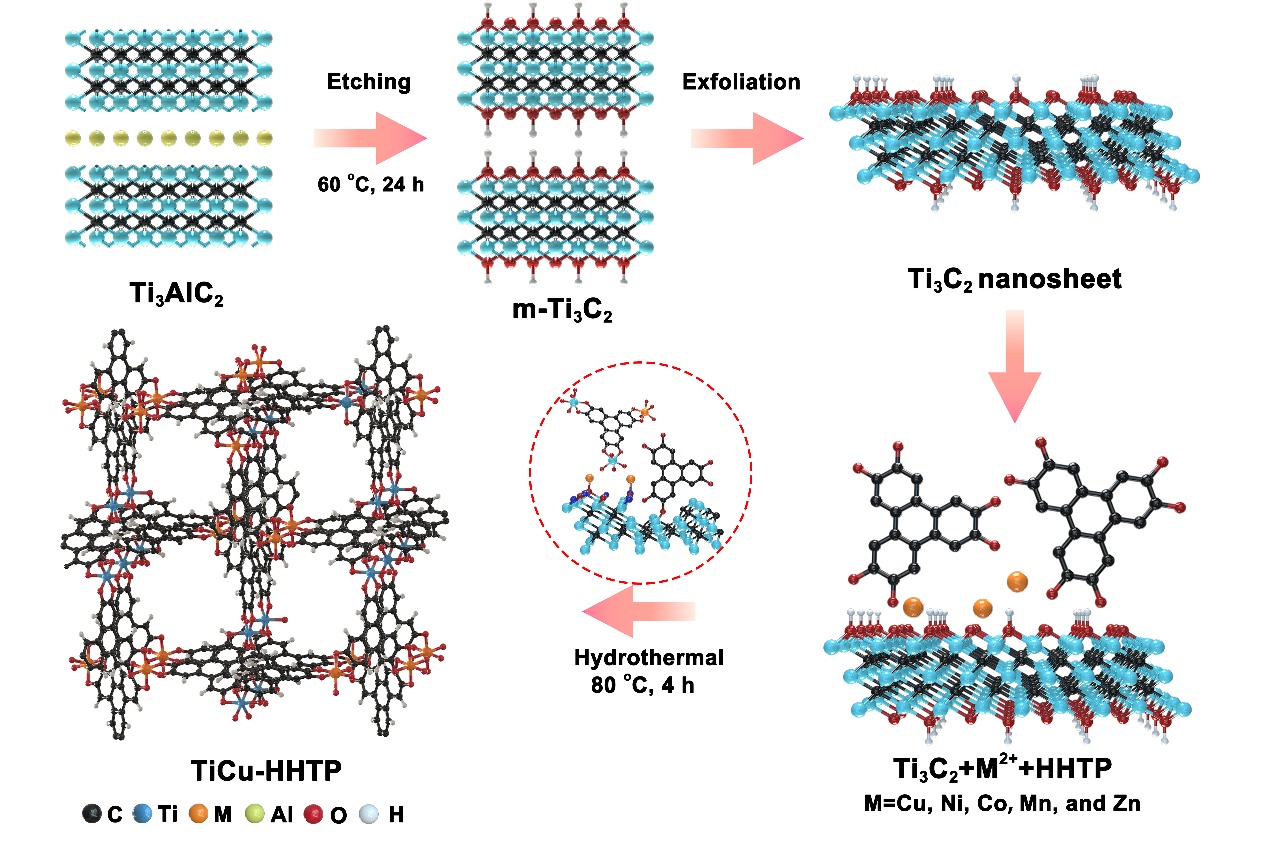 图1. 通过金属离子辅助转化法制备TiCu-HHTP的示意图