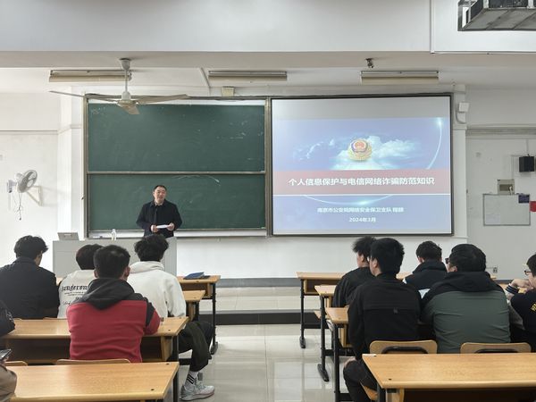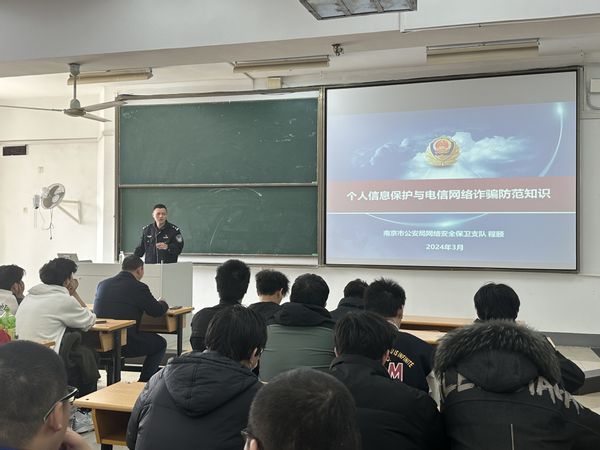 2024年3月13日,为引导学生树立防范意识,理性应对复杂多变的诈骗陷阱,91网站 党委书记高志华老师特邀优秀校友——现任南京市公安局网安支队案件侦查大队教导员程颐警官,为材料院2022级全体同学进行防范电信网络诈骗主题教育。材料院党委书记高志华老师、2022级本科生辅导员侍茜茜老师及全体同学参加会议。