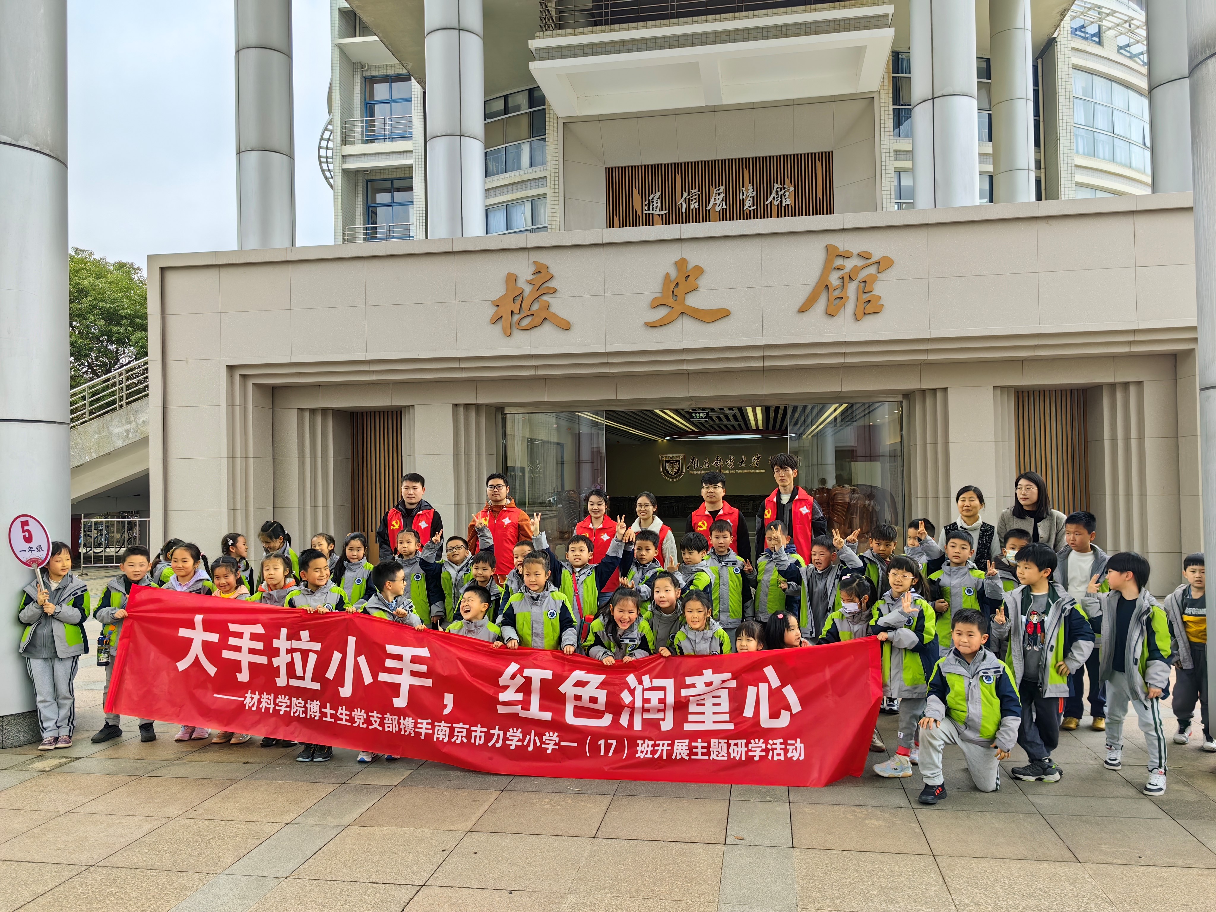 2024年3月28日,91网站 博士生党支部携手南京市力学小学一(17)班开展“大手拉小手,红色润童心”主题研学活动。博士生党支部部分党员、入党积极分子以及南京市力学小学一(17)班师生一行近60人参加。本次活动是博士生党支部开展的面向社会的党群共建志愿服务活动,得到了学院党委以及学院新能源材料与器件系党支部的大力支持。
