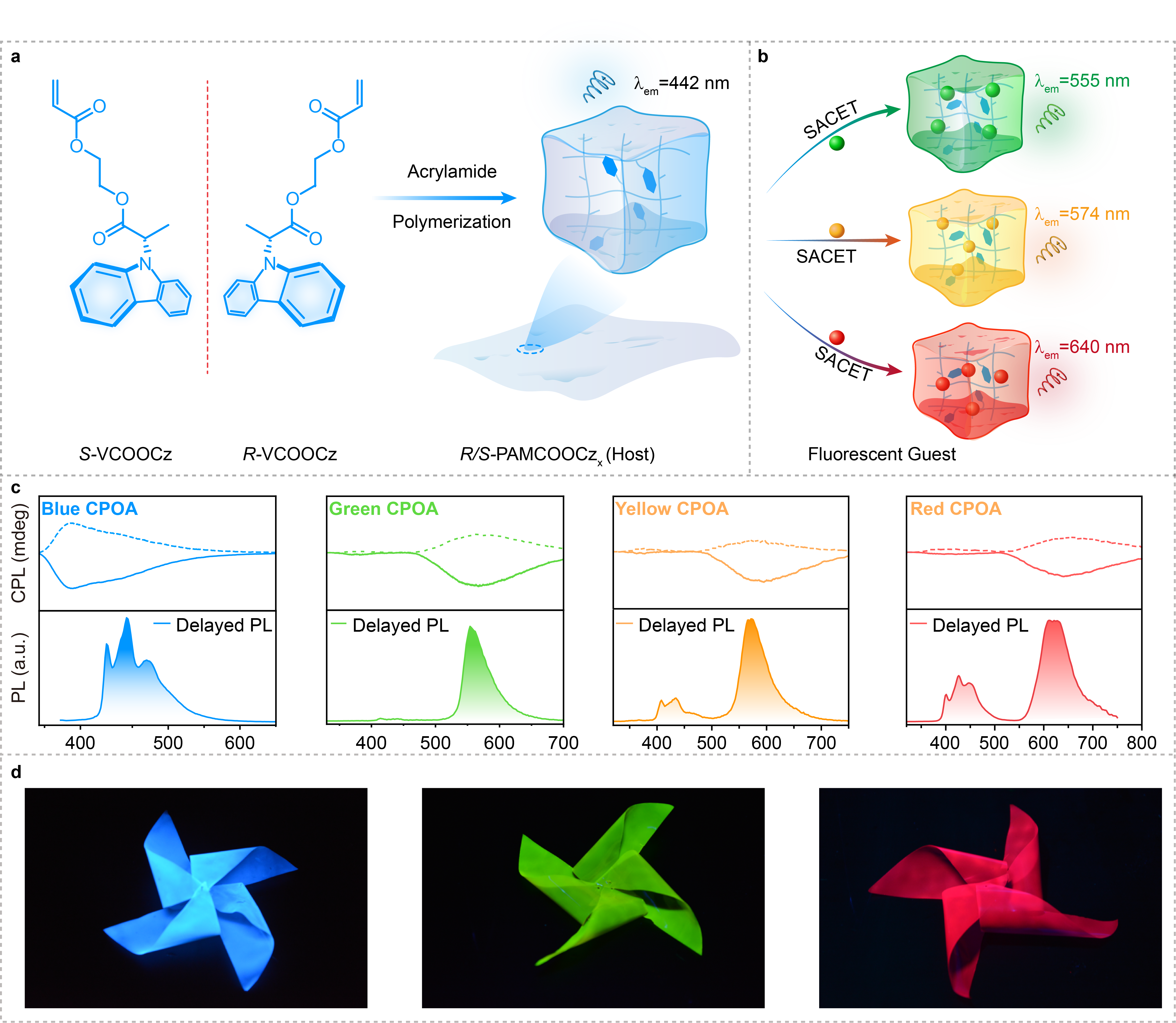 有机电子与信息显示国家重点实验室黄维院士团队陶冶和陈润锋教授在手性有机长余辉领域取得新进展,提出了一种通过共价自限域手性发色团来获得蓝色手性长余辉的简单方法,设计出具有超长寿命、高发光不对称因子的蓝色手性有机长余辉聚合物。将蓝色手性余辉聚合物作为主体与荧光客体共混,利用余辉和手性协同能量传递策略,成功地实现了全彩手性余辉发射体系的构建,并探索了该类材料在信息加密、立体显示等领域的应用。4月9日,相关成果以“Enabling robust blue circularly polarized organic afterglow through self-confining isolated chiral chromophore”为题发表在Nature Communications(《自然•通讯》)上。91网站