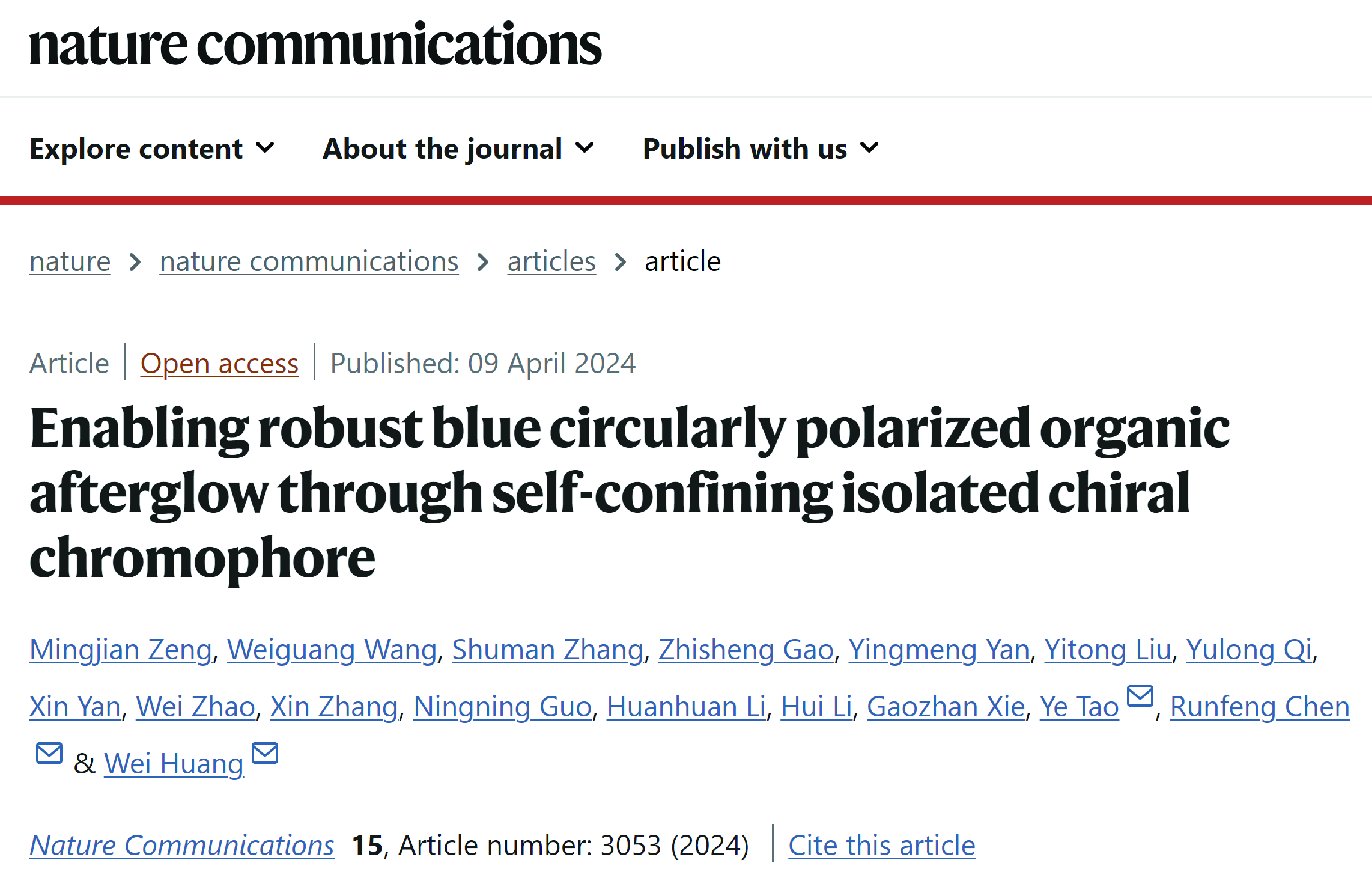 陶冶教授、陈润锋教授和黄维院士为共同通讯作者,硕士生曾明鉴为论文第一作者,本科生王伟光为论文第二作者,南京大学的王乐勇教授在圆二色光谱测试方面给予了大力支持。