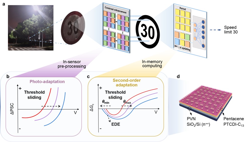 a集成了图像预处理和识别功能的视觉系统示意图;b光自适应阈值滑移、c二阶自适应突触再可塑性和d器件结构示意图