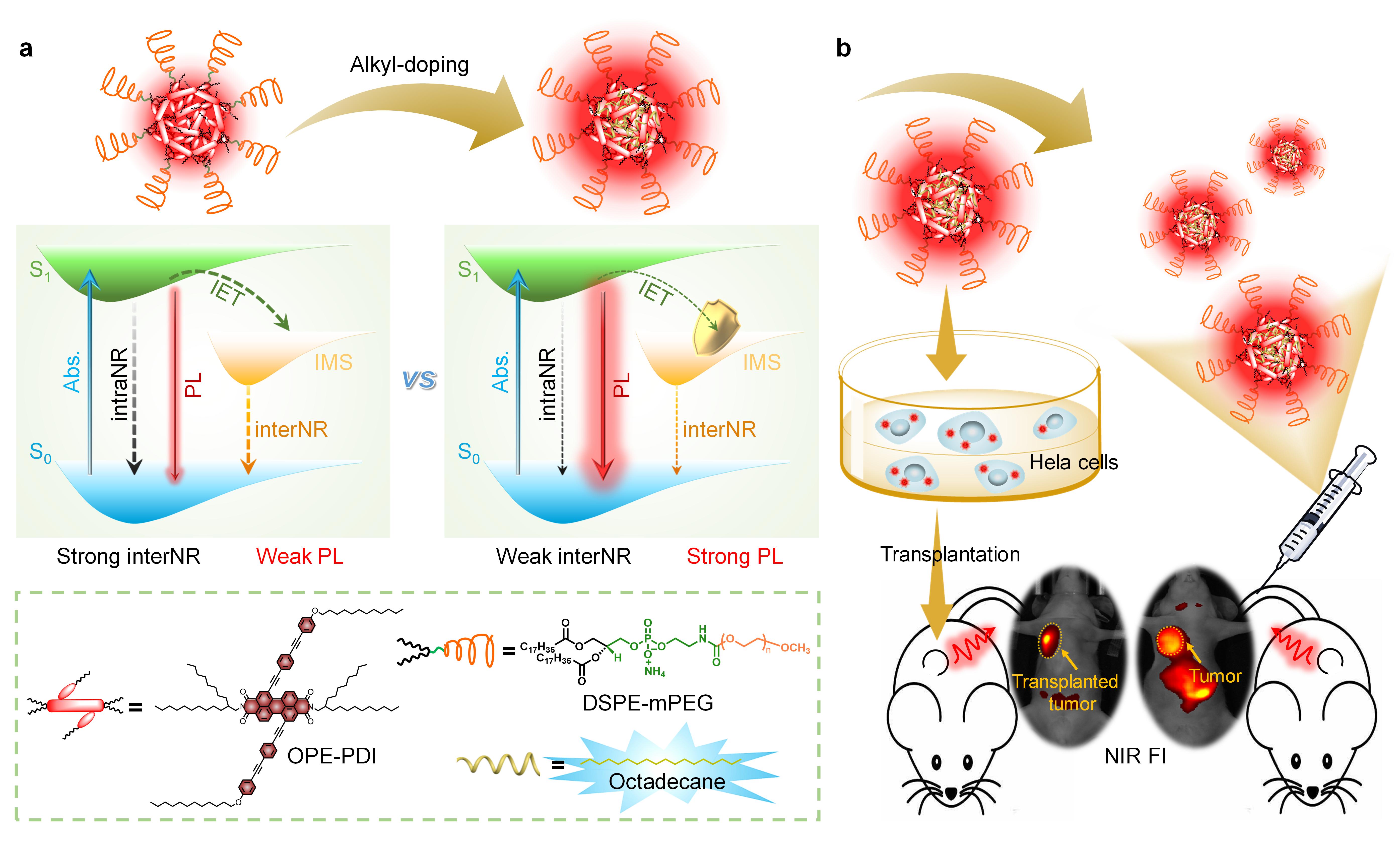 :a)十八烷掺杂前后OPE-PDI纳米颗粒的激发态能量耗散示意图;(b)掺杂十八烷的OPE-PDI纳米颗粒用于活体肿瘤实时成像和生长状况的长期监测示意图。