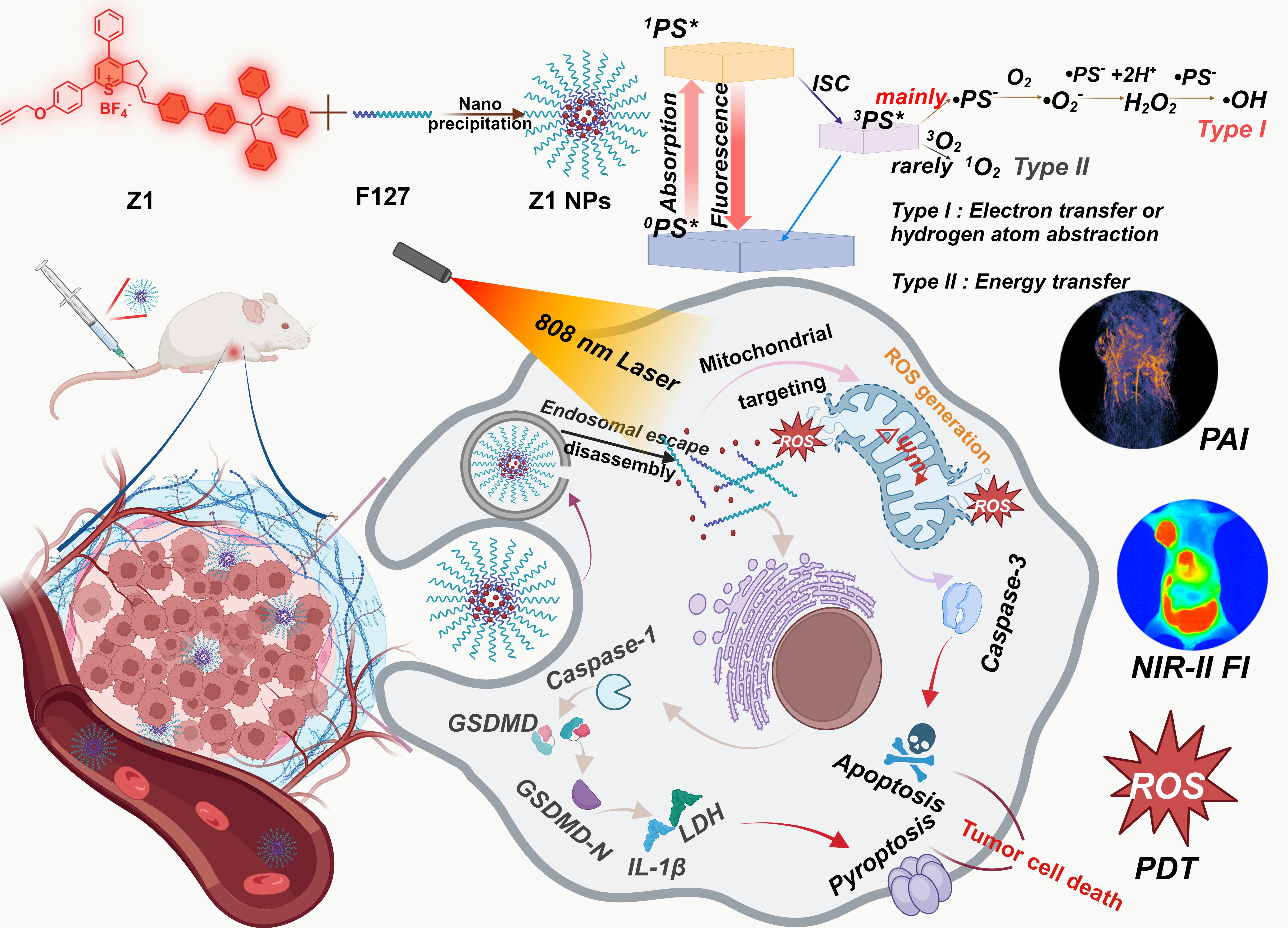 针对上述问题,该团队开发了四种具有不同苯环数的硫吡啶结构分子Z1-Z4,初步探索它们的光动力性能。其中,Z1具有更高的苯环占比,表现出优异的ROS生成和线粒体靶向能力以及大的斯托克斯位移。通过两亲性聚合物F127Z1包覆,制备了Z1 NPsZ1 NPs808 nm激光照射下表现出高ROS生成(尤其是IROS),可引起线粒体功能障碍,并通过细胞焦亡和细胞凋亡有效抑制肿瘤生长,且副作用最小。此外,该Z1 NPs还能实现活体NIR-II荧光成像和光声成像。