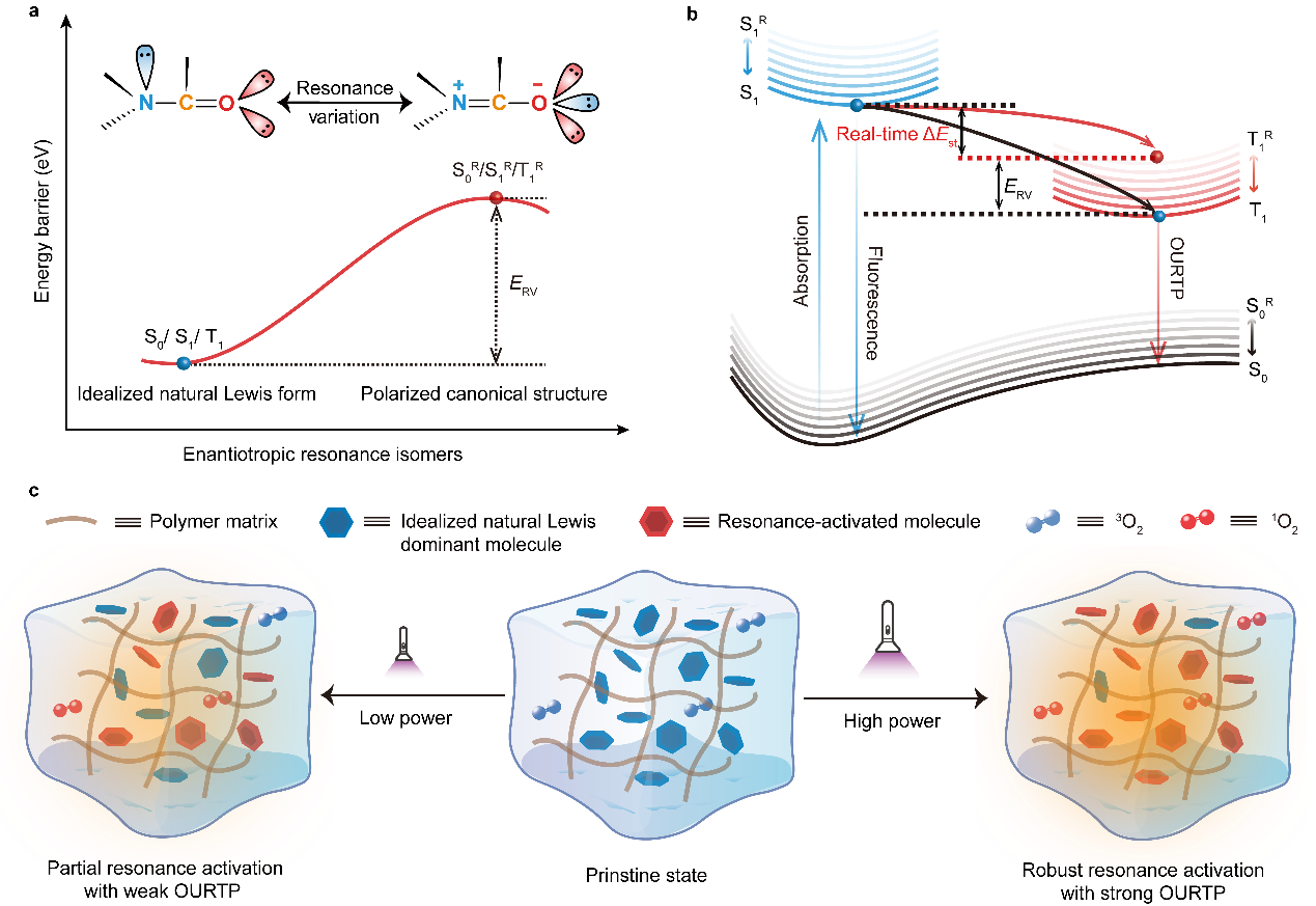 图1:(a)共振互变及共振能示意图;(b)共振互变减小实时单线态—三线态能量差(c)共振活化程度不同致使OURTP强弱差异
