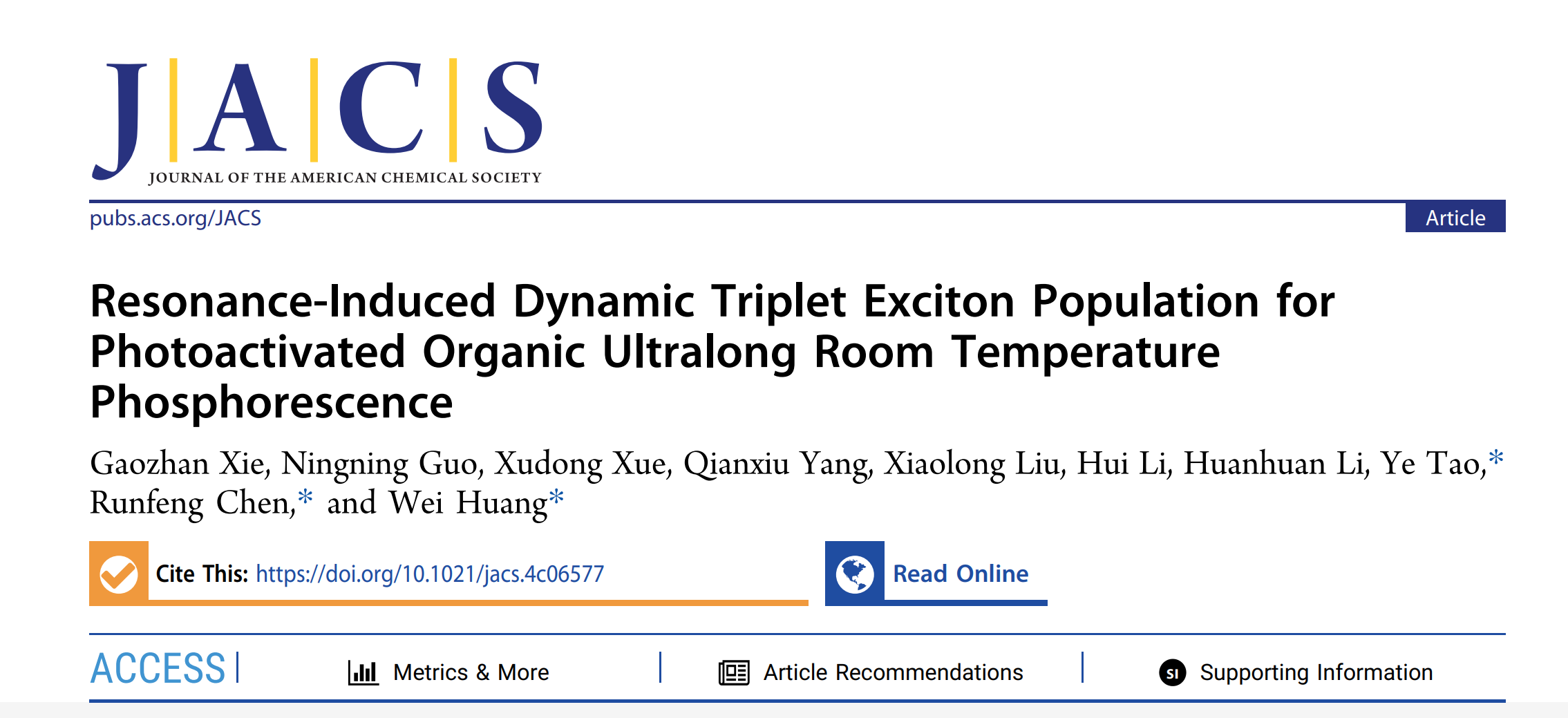 近日,有机电子与信息显示国家重点实验室黄维院士团队陶冶和陈润锋教授在有机材料激发态调控领域取得新进展,提出了共振诱导激发态调控策略,通过在有机磷光体中引入N-C=O共振结构,有效调控了三线态激子的产生。强的激发光会促进共振活化,使更多共振单元从能量较低的理想路易斯结构(N-C=O)向能量更高的极化极限式结构(N+=C–O−)转变,促进系间窜越(ISC)过程,产生更多三线态激子,从而提高材料的光活化超长有机室温磷光(OURTP)性能,相关成果以“Resonance-Induced Dynamic Triplet Exciton Population for Photoactivated Organic Ultralong Room Temperature Phosphorescence”为题发表在Journal of the American Society(《美国化学学会杂志》)上。陶冶教授、陈润锋教授和黄维院士为共同通讯作者,青年教师谢高瞻为论文第一作者。