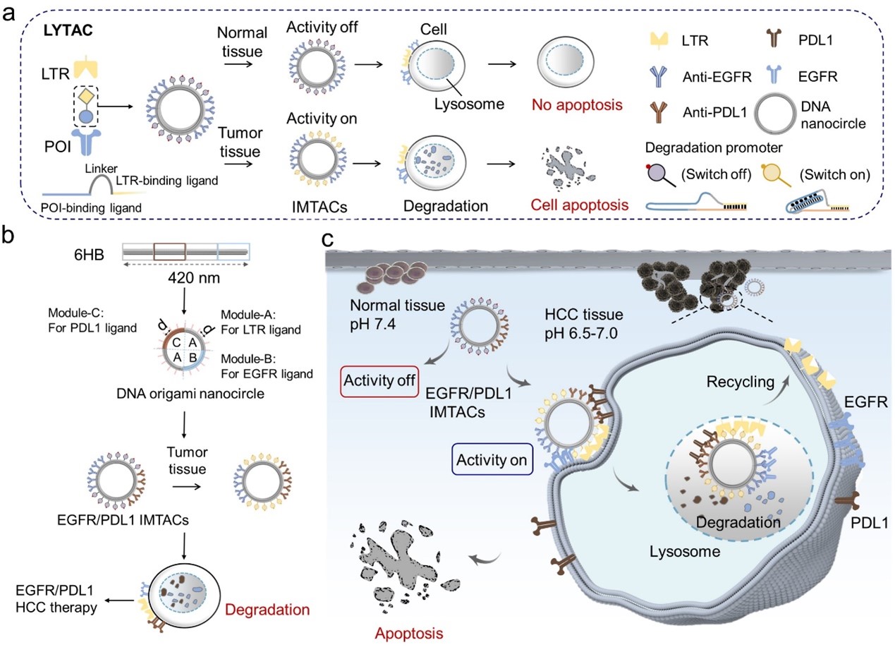 为了实现这一目标,汪联辉教授、晁洁教授带领的团队设计了一种可编码DNA纳米平台,利用智能模块化DNA LYTACs(IMTACs)纳米器件,在肿瘤微酸环境中特异性降解多种致病蛋白。DNA环状折纸具有高稳定性、低免疫原性和可编程性,及近端排布等优点,满足了对不同配体的精准排布的需求,是IMTACs的理想纳米载体。通过精确控制LTRs和蛋白配体的化学计量学和模块化分布,IMTACs纳米器件能够精确定位和递送到肿瘤组织中。在肿瘤组织中,酸性肿瘤微环境触发激活降解开关,IMTACs多价结合,并有效降解各种预先指定的蛋白质。IMTACs的组织特异性和多价配体显著提高了药物利用率,同时减少了脱靶效应。重要的是,该系统显示了肿瘤组织中EGFR和PDL1协同降解的能力,可用于肝细胞癌(HCC)的联合靶向和免疫治疗。此外,DNA折纸纳米结构可以结合不同类型的靶配体(适体、RNA、肽、抗体等),从而促进了新的靶蛋白降解剂的灵活设计。该研究扩大了靶向蛋白降解的范围,并为发现各种疾病的创新疗法提供了新的思路。