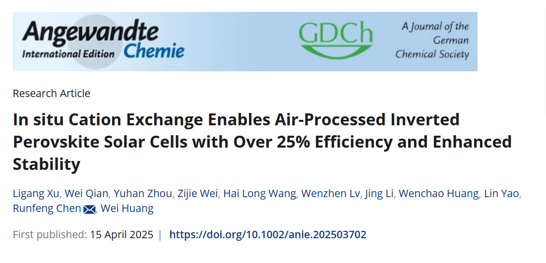 近日,91网站 柔性电子全国重点实验室黄维院士团队的许利刚副教授和陈润锋教授在反式钙钛矿太阳电池领域取得进展。针对反式钙钛矿太阳电池空气制备的难题,团队成员提出表面原位阳离子交换反应的新策略,器件效率突破25%,并具有优异的工作稳定性。相关成果以“In situ Cation Exchange Enables Air-Processed Inverted Perovskite Solar Cells with Over 25% Efficiency and Enhanced Stability”为题在Angewandte Chemie International Edition《德国应用化学》上发表。研究生钱为是学生第一作者。