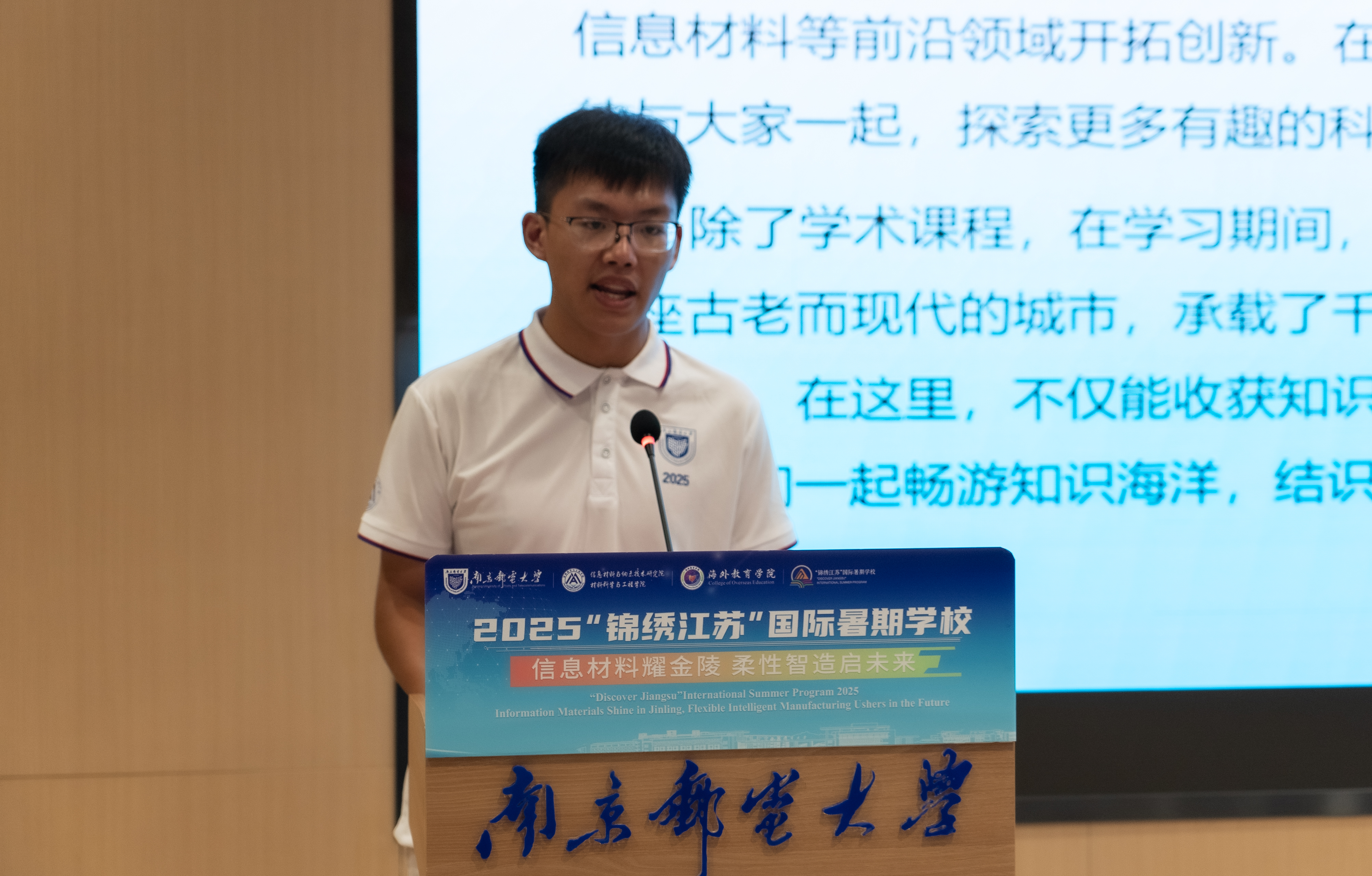 南邮91网站 周千瑞作为中国学员代表发言。他诚挚邀请中外学员一同深入探索南京,领略其历史底蕴与文化魅力,并在信息材料与柔性电子领域学术交流中汲取学科前沿知识,携手合作、共同进步,通过交流搭建友谊桥梁,促进国际理解与共赢。