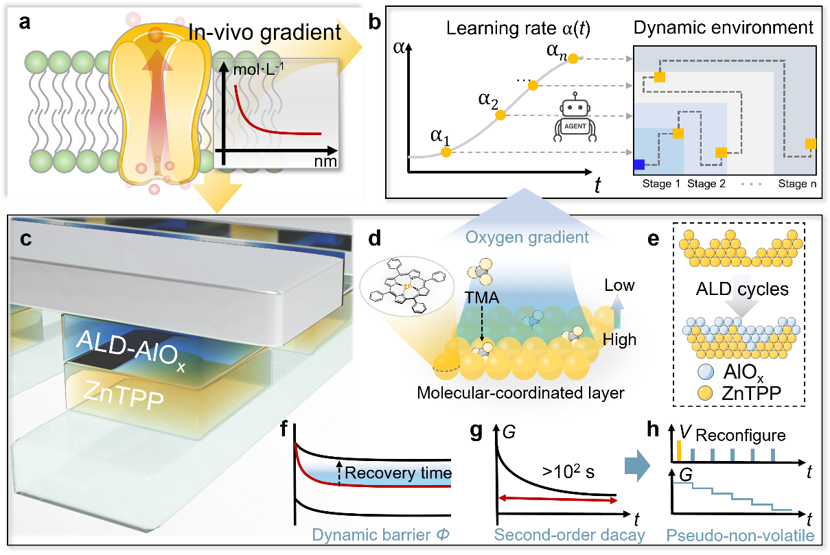 持续学习是人类认知系统的重要能力,其核心在于能够在动态环境中持续获取、整合并更新知识。近年来,强化学习被认为是实现持续学习的重要算法框架。然而,在硬件层面实现类似生物系统的时间自适应调控机制仍面临挑战。传统忆阻器在离子迁移过程中往往缺乏稳定的内在梯度结构,容易产生随机且突变的电导变化,难以形成稳定且具有时间关联性的内部状态,从而限制了其在持续强化学习中的应用。